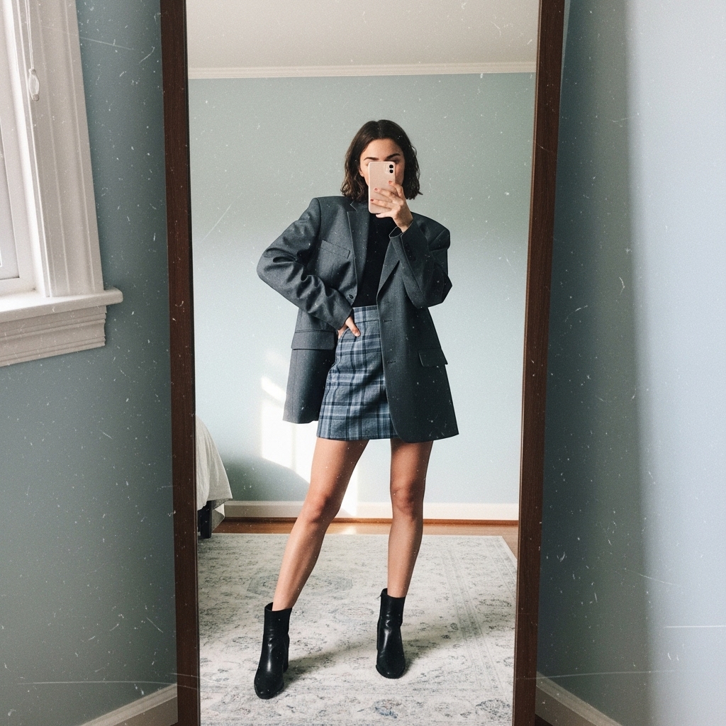 Power dressing meets fall chic with oversized blazers and mini skirts — one of the hottest combos this season. Pair a structured blazer with a fitted skirt for a playful yet polished vibe. Add sheer tights and ankle boots for warmth, and accessorize with a leather belt to define your waist. This outfit works equally well for coffee runs, shopping days, or even nights out with friends. It’s effortlessly confident and versatile.
