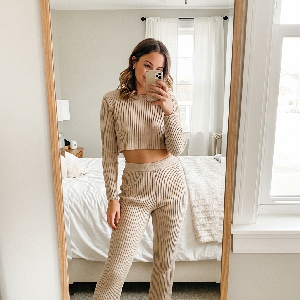 Knit sets are the definition of chic comfort. Whether it’s a matching ribbed top and pants or a soft sweater-and-skirt combo, this trend blends lounge vibes with elevated style. Opt for earthy tones like camel or sage green to match the fall palette. Add gold jewelry and sleek boots for polish. It’s an easy go-to for brunch, errands, or even a casual office day while keeping you stylishly snug.