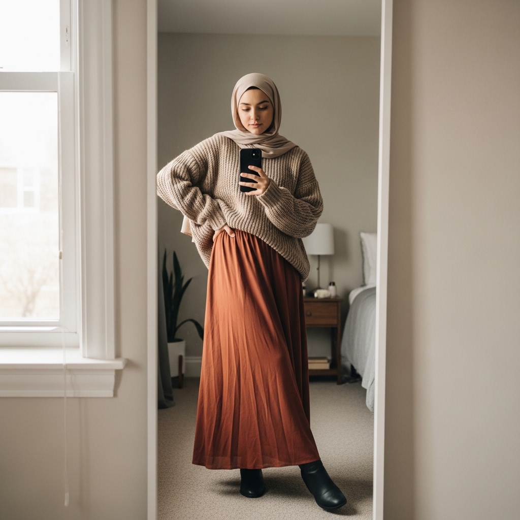 Pairing an oversized knit sweater with a flowy maxi skirt creates a relaxed yet feminine fall outfit. Add a neutral hijab and ankle boots for a polished look that’s perfect for casual outings. The mix of cozy textures and modest coverage makes this combo both practical and trendy. Stick to earthy tones like beige, caramel, or rust to enhance the autumn vibe.