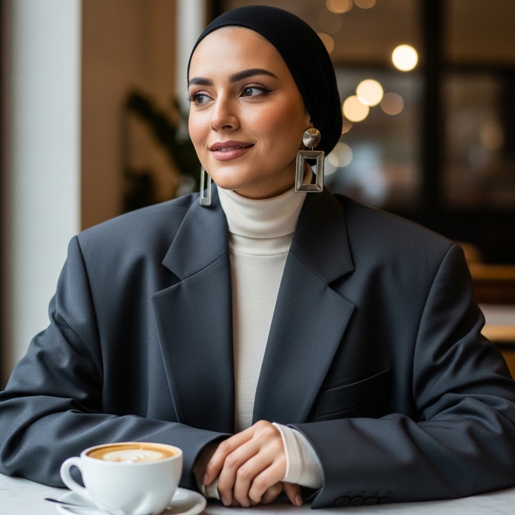 An oversized blazer with a fitted turtleneck and tailored pants creates a structured yet relaxed hijabi outfit. It’s perfect for work, events, or café dates. Add a chiffon hijab tucked neatly and finish with loafers or boots. The outfit screams confidence and fall sophistication.