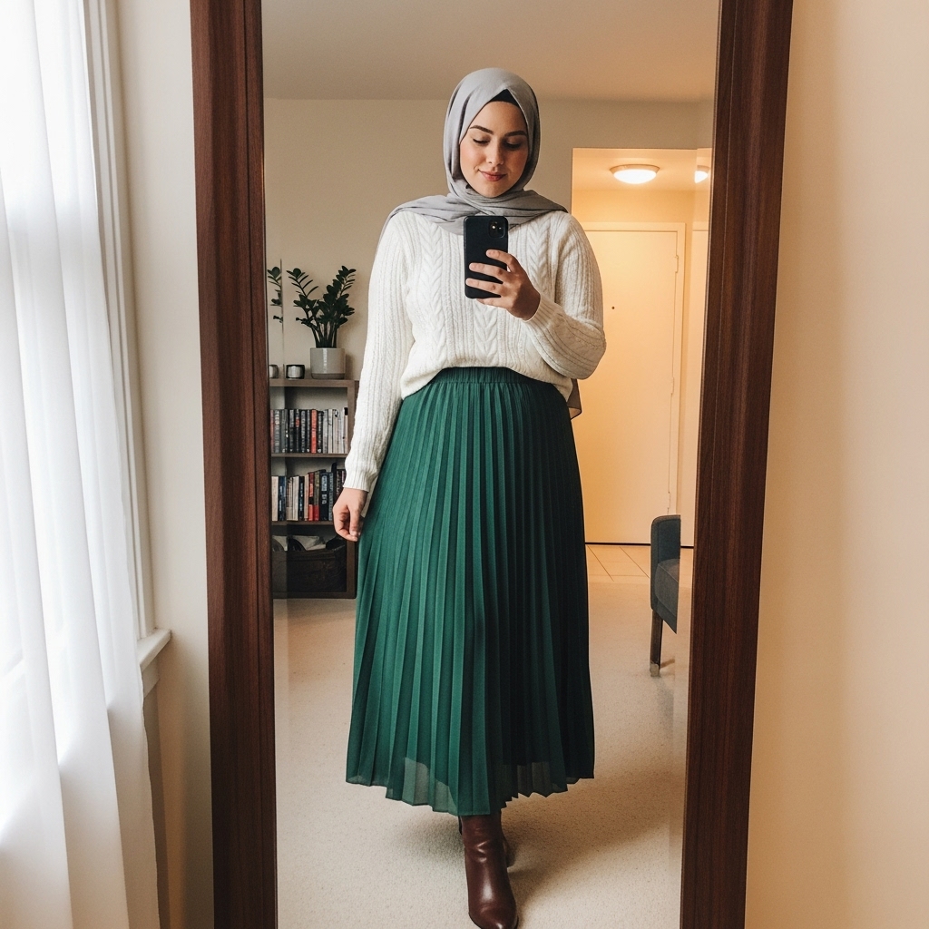 Pleated skirts are timeless and perfect for hijabis. Pair them with a tucked-in sweater or knit top and a matching hijab. Go for fall-inspired hues like rust, olive, or burgundy. Add ankle boots and minimal jewelry for an elegant, feminine look that’s cozy yet put-together.