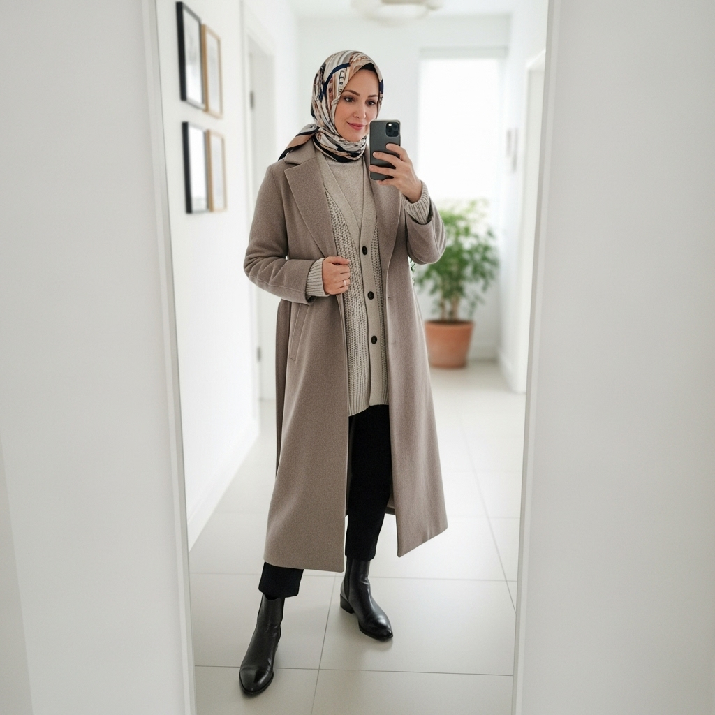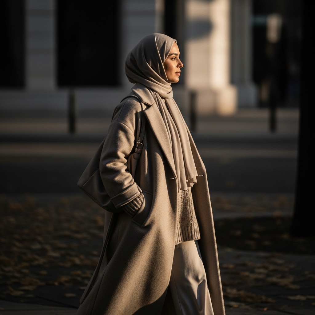 A long wool coat instantly elevates any hijabi outfit. Throw it over a midi dress or layered knitwear for warmth and elegance. Add a coordinating scarf, structured handbag, and leather boots. It’s the ultimate modest fashion statement for fall — timeless and effortlessly stylish.