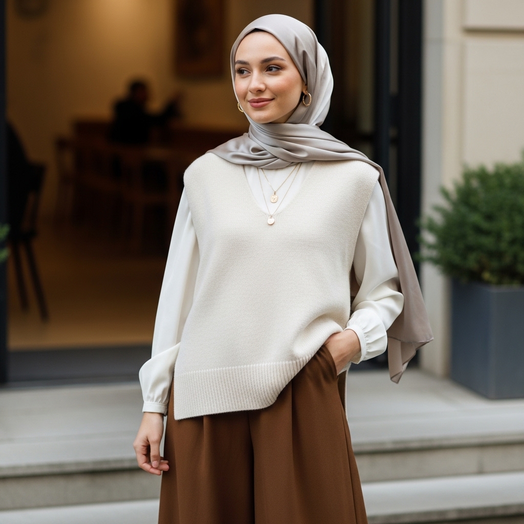 Layer a knit vest over a long-sleeve blouse and culottes for a trendy, modest outfit. This fall-inspired combo feels fresh and stylish while staying modest. Choose earthy colors like mocha or olive green. Add a satin hijab and gold accessories to bring out that soft-glam finish.