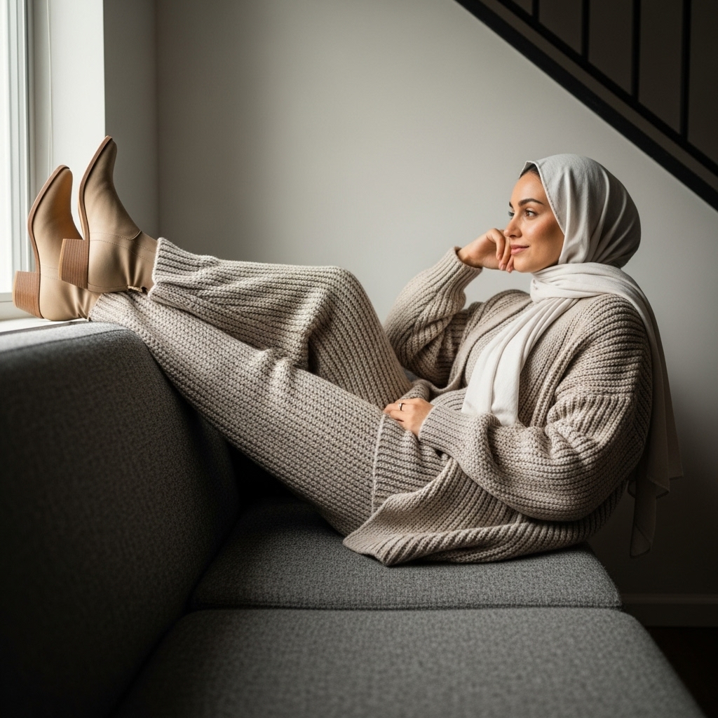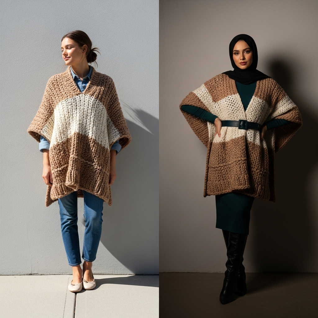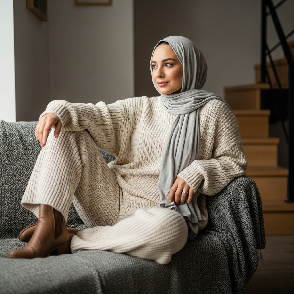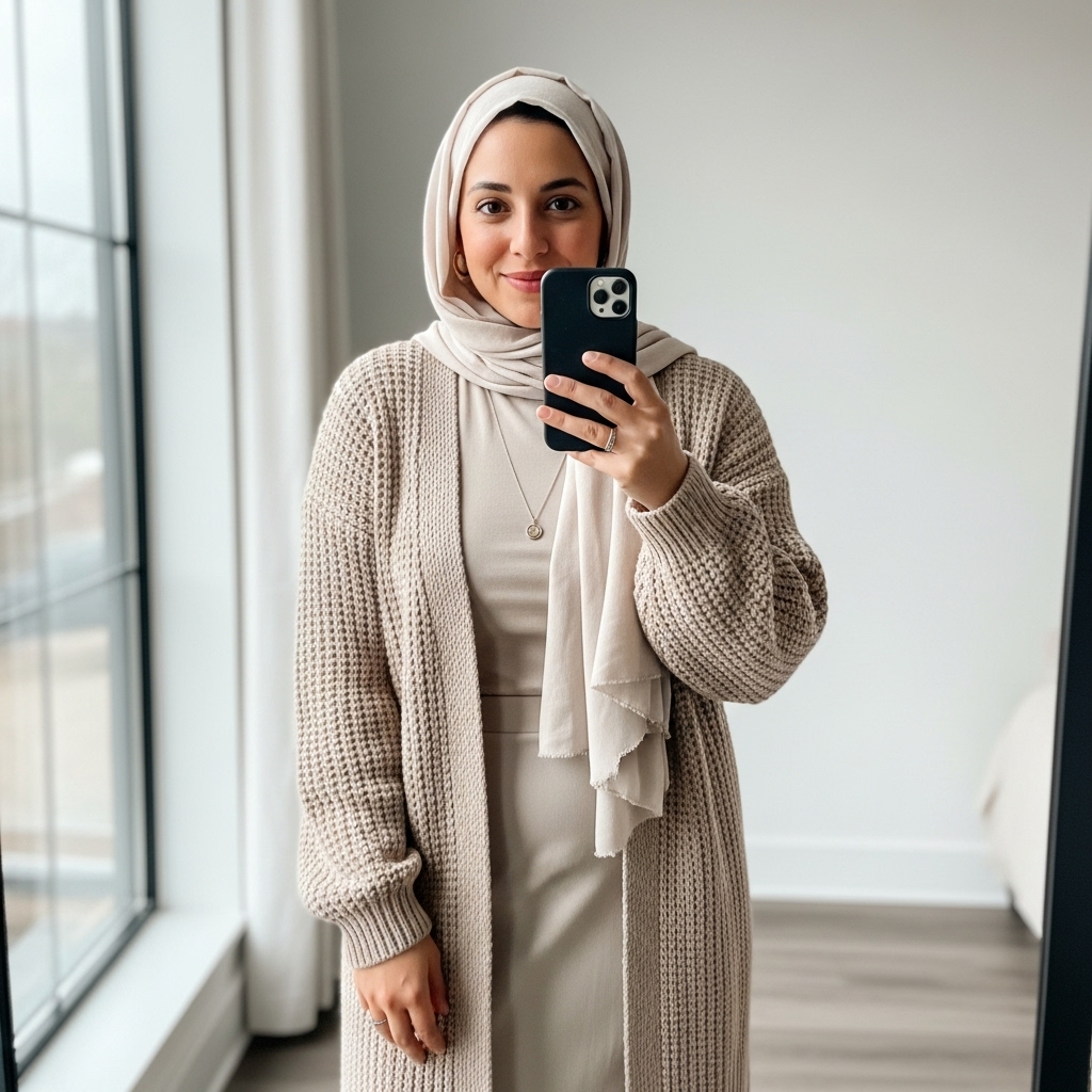 A knit poncho or cape adds texture and coziness to your hijabi outfit. Style it over jeans or a maxi skirt with a turtleneck underneath. Choose rich autumn shades like burgundy, camel, or dark green. The result is modest, warm, and incredibly stylish for fall days.