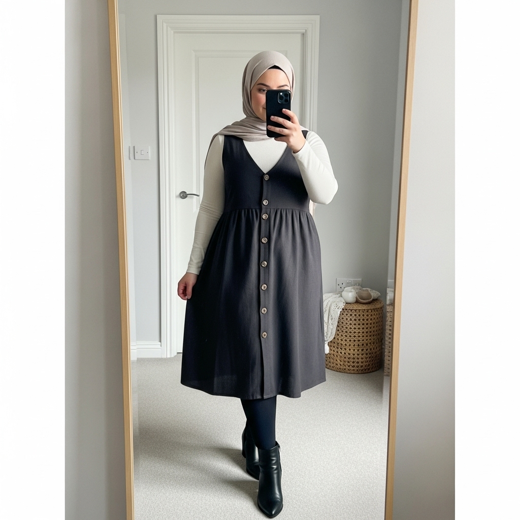 Layer a button-up dress over a fitted turtleneck for a creative, modest fall outfit. Add boots and a neutral hijab for balance. This style gives you versatility and warmth while keeping your look elegant and fresh. It’s great for work or casual weekends.