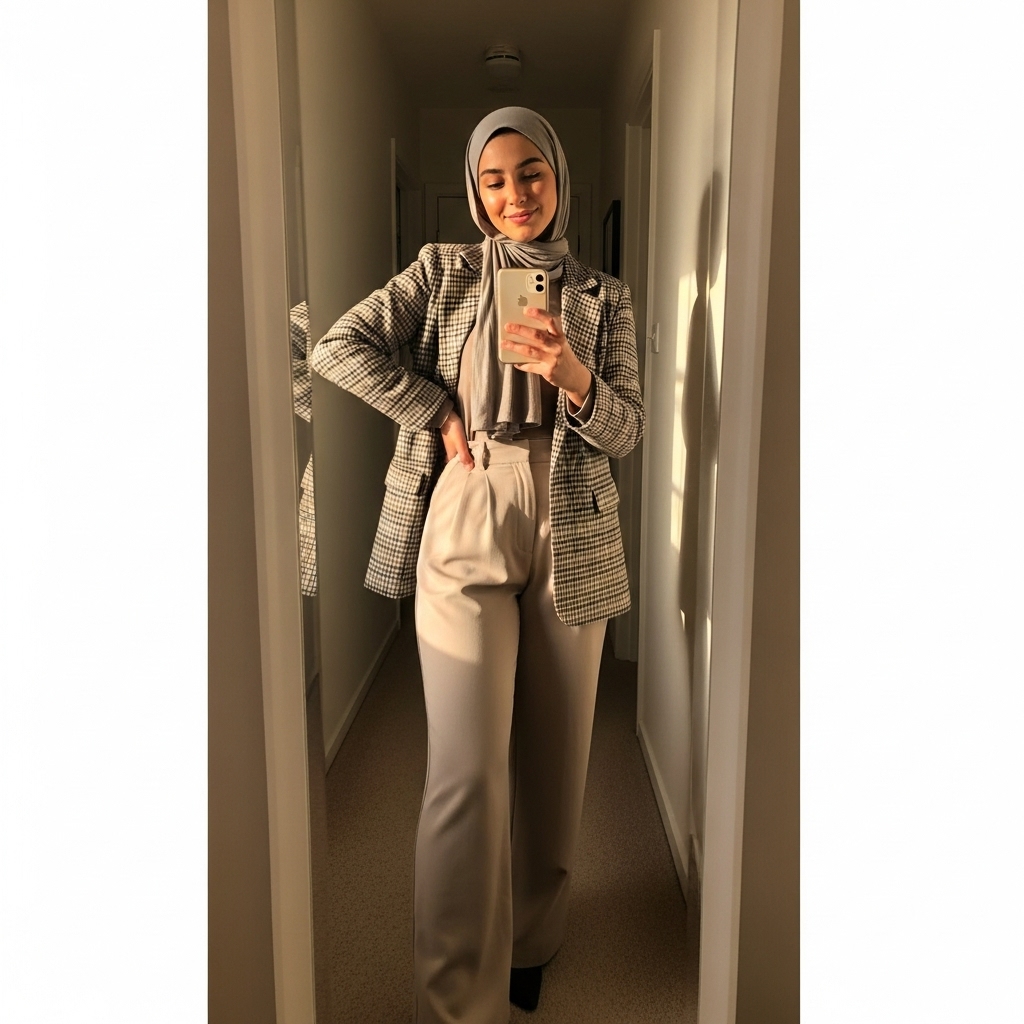 For a smart-casual hijabi fall outfit, go for a plaid blazer with wide-leg trousers. Add a plain inner shirt and a matching hijab for a neat, put-together look. This outfit blends professionalism with modern modesty — perfect for work or brunch days. Pair with loafers or ankle boots to complete the stylish ensemble.