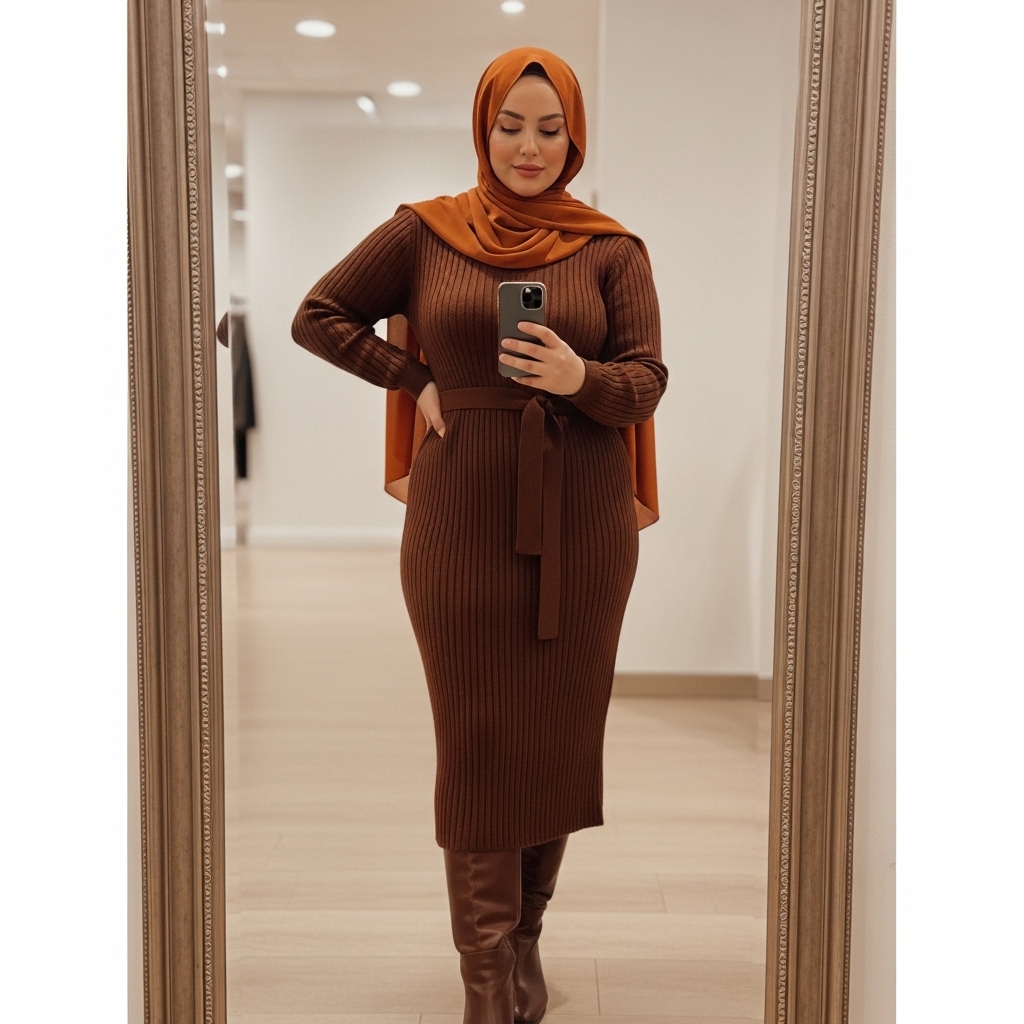 A belted knitted dress is a go-to for hijabis who love minimal yet flattering fall styles. Choose a ribbed texture for extra warmth and pair it with tall boots or heeled booties. Add a structured coat and a printed hijab for balance. It’s modest, comfy, and perfect for casual or semi-formal occasions.