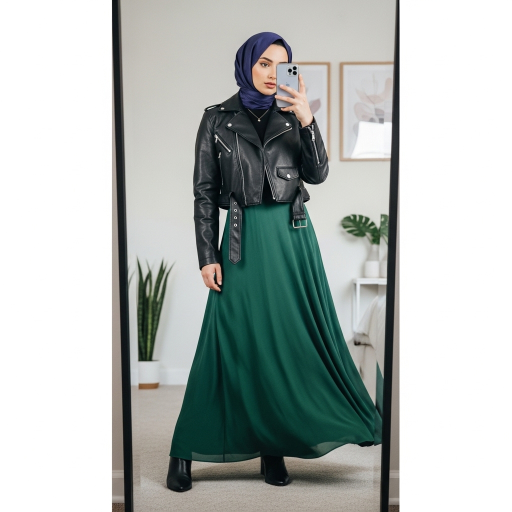 Mix edgy and modest with a leather jacket over a maxi skirt and tucked-in turtleneck. Choose a lightweight hijab to balance the layers. Black or deep brown jackets give the outfit that “cool hijabi” edge. Add boots for a complete autumn-ready statement look that’s confident and warm.