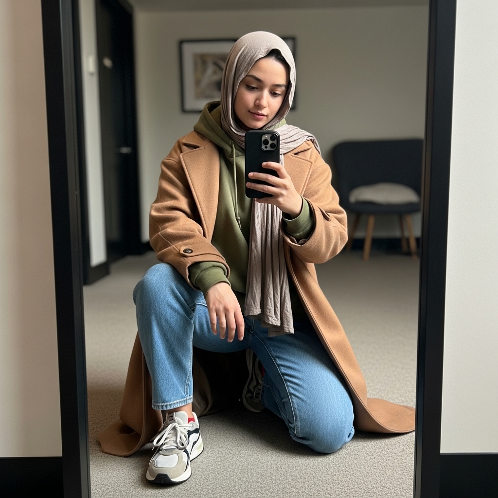 If you love street-style hijabi outfits, this one’s for you. Layer a hoodie under a long coat and pair it with straight jeans or joggers. Add sneakers and a pashmina hijab for that casual-cool fall vibe. It’s trendy, practical, and perfect for teens or university students who want to stay warm and stylish.