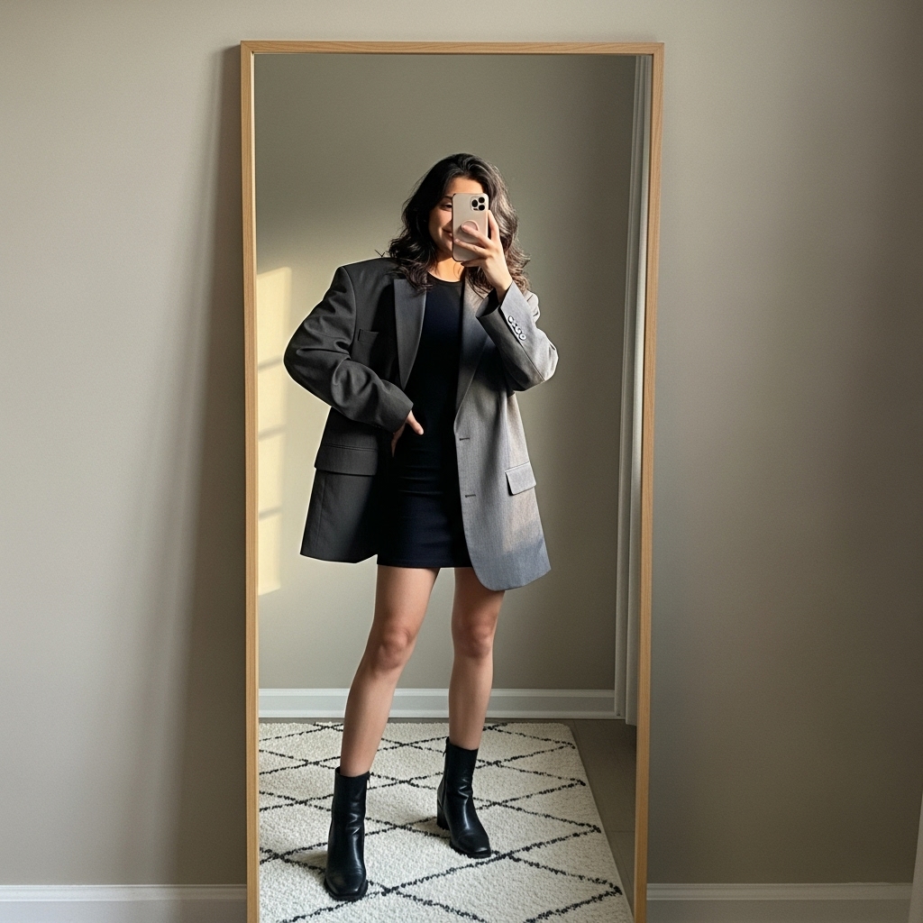 Pairing an oversized blazer with a fitted mini dress creates the perfect balance between chic and bold. This trending fall look gives structure and confidence while keeping it feminine. Add heeled boots or knee-highs and minimal jewelry to complete the outfit. For a casual night out, choose neutral tones like beige or gray; for bolder vibes, go for deep burgundy or forest green.