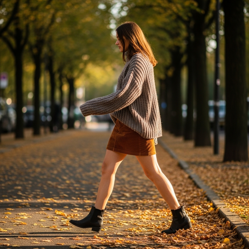This combo is cozy yet flirty — the oversized sweater gives warmth, while the mini skirt keeps it playful. Try a chunky knit with a corduroy or pleated skirt. Add ankle boots and a crossbody bag for balance. Stick to earthy hues like rust, beige, and olive for that perfect fall feel.