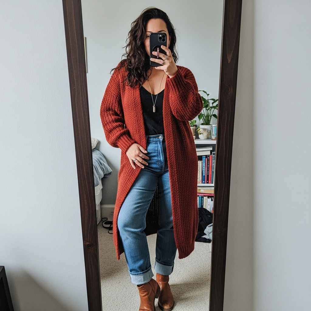 A long cardigan adds effortless charm to any casual outfit. Pair it with jeans and a fitted top or bodysuit for everyday comfort. Add booties and a wide-brim hat for that autumn influencer vibe. Choose soft, textured knits in caramel, mocha, or cream for a warm look. This outfit is simple yet stylish — perfect for busy fall days.