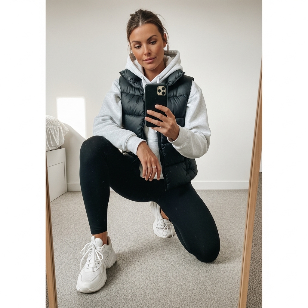 Athleisure meets chic in this trendy fall combo. Pair a sleek puffer vest with leggings, a cropped hoodie, and sneakers. It’s perfect for running errands or casual outings. Go for a glossy or matte vest finish and experiment with fall tones like forest green or cinnamon brown. It’s a sporty yet fashionable outfit that’s functional and cute.