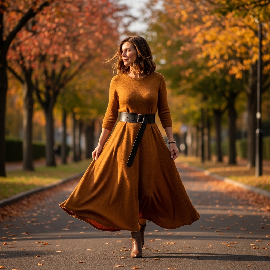 Knit maxi dresses are both comfortable and elegant. Add a wide belt to accentuate your waist and pair with ankle boots. Choose warm fall colors like deep brown, rust, or dark green. A soft scarf and minimal jewelry complete the look. This outfit blends comfort and polish — ideal for both casual and formal fall occasions.