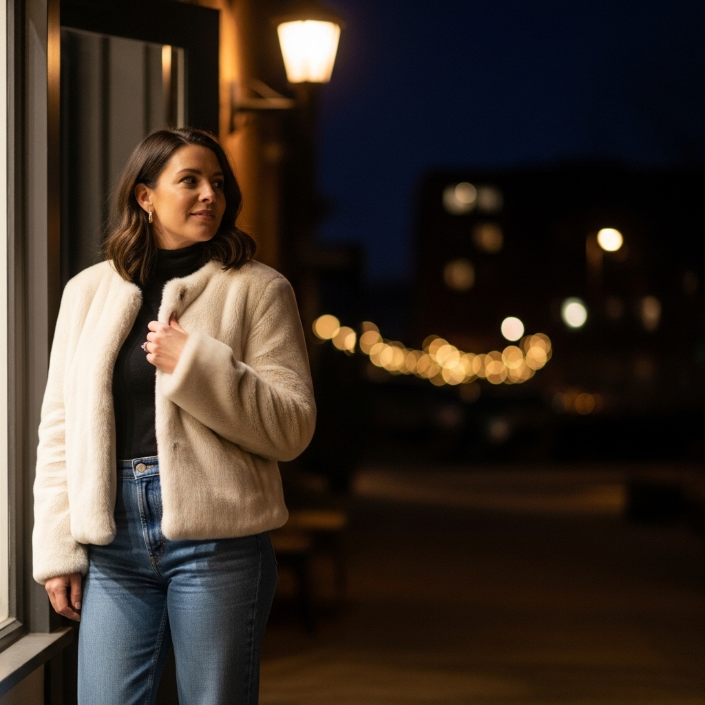 A faux fur jacket instantly makes any outfit more glamorous. Pair it with straight jeans, a fitted turtleneck, and ankle boots. Choose neutral tones like ivory or beige for classic charm or go bold with chocolate brown. This outfit gives cozy luxury vibes and is perfect for dinner or city nights.