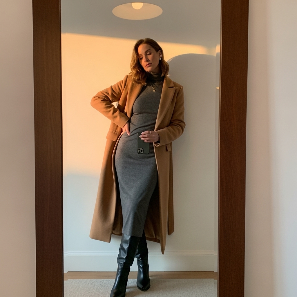 When the temperatures drop, a long coat over a fitted turtleneck dress becomes a classy fall essential. This combo brings warmth and sophistication in equal measure. Add a belt to define your waist and pair with suede boots for an elevated vibe. Neutrals like camel, ivory, or charcoal make this look timelessly elegant and perfect for any occasion.