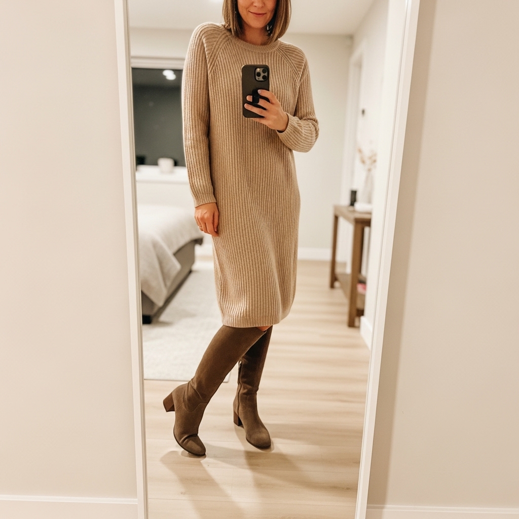 Few outfits scream fall like a cozy sweater dress paired with tall boots. It’s equal parts comfortable and stylish. Choose a ribbed or chunky knit dress and match it with leather or suede boots. Add a statement belt or layered jewelry for polish. This outfit transitions beautifully from day to evening with minimal effort.