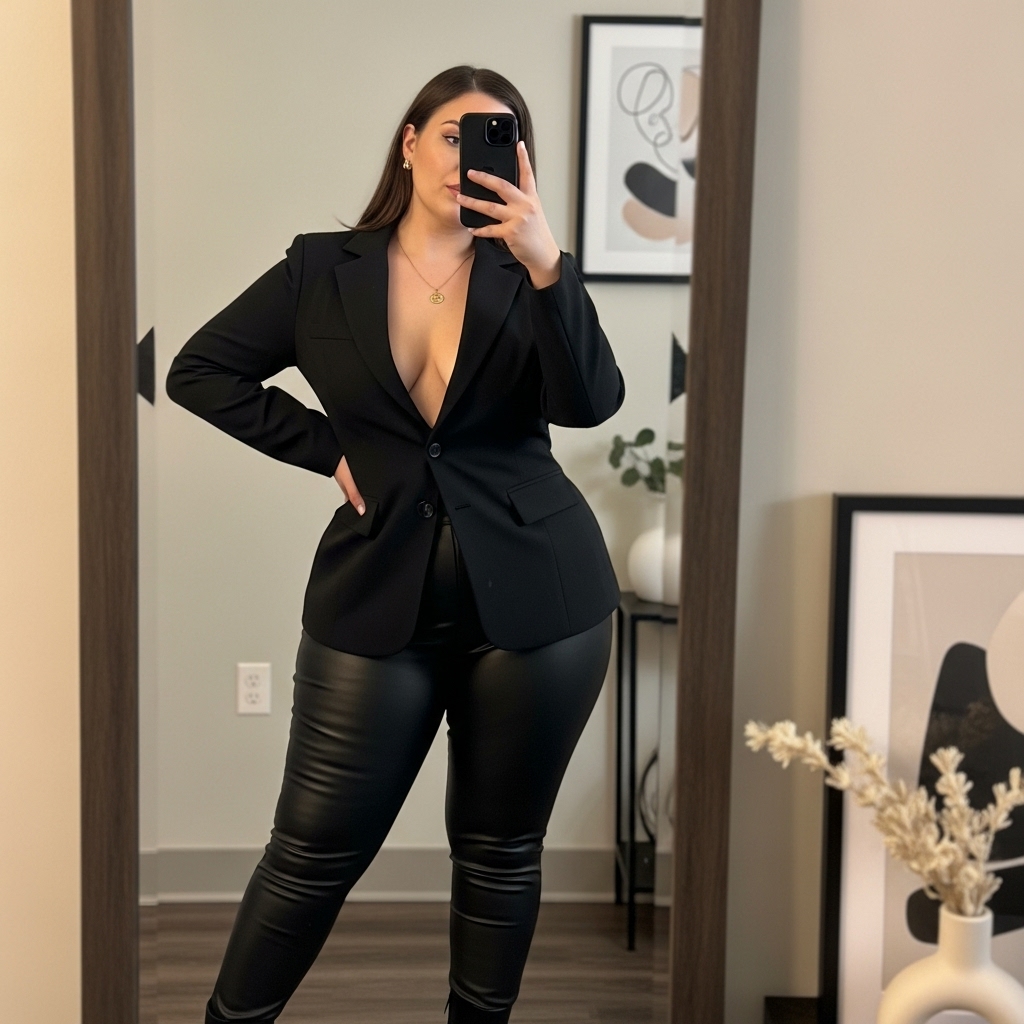 A power outfit for modern women — faux leather pants styled with a structured blazer are sleek, confident, and sexy in a classy way. Pair with pointed heels and a neutral top underneath. Go for monochrome black or mix tones like brown and ivory. This outfit works perfectly for dinner dates, parties, or nights out downtown.