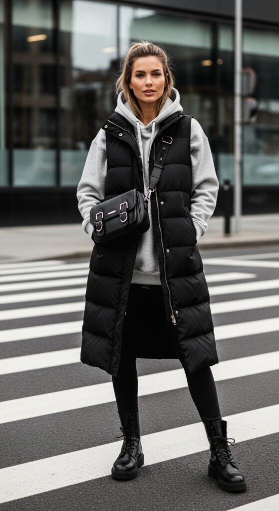 Stay sporty yet chic with a long puffer vest layered over a hoodie and leggings. The contrast of layers gives depth and warmth to your outfit. Pair it with chunky sneakers or combat boots for that winter streetwear vibe. It’s a go-to look for busy, on-the-go days.