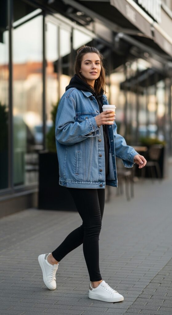 Classic and cool, a denim jacket over a hoodie and leggings is a timeless choice. Add a beanie and white sneakers for casual perfection. You can also switch it up with a shearling-lined denim jacket for extra warmth. This leggings outfit for winter hits the perfect balance of laid-back and stylish.