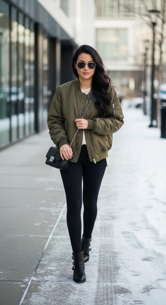 Add a sporty-chic vibe with a bomber jacket and leggings. Choose neutral colors like beige, olive, or black for an elevated aesthetic. Pair with sneakers or ankle boots. This outfit is perfect for errands, coffee catch-ups, or even travel days when comfort is key.