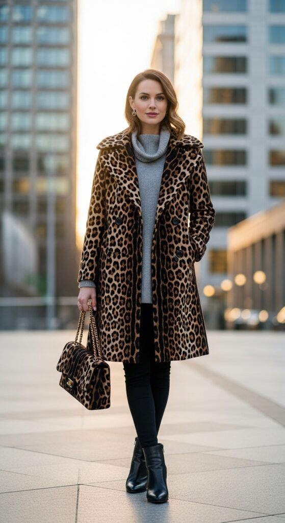 A fitted turtleneck with leggings creates the base for layering a bold, statement coat. Think plaid, leopard, or bright colors. This outfit turns heads while keeping you warm. Add sleek boots and a crossbody bag for a refined finish.