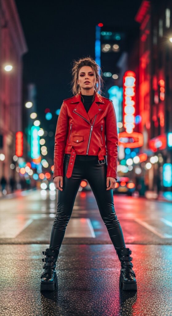 Pair your favorite leather jacket with classic black leggings for an edgy winter aesthetic. Add a hoodie or knit underneath for layering and warmth. Finish with chunky boots or platform sneakers. It’s a bold yet timeless look that’s easy to recreate.