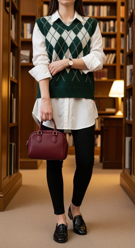 Layer a crisp white button-up shirt under a knit sweater vest and pair with leggings for a chic preppy look. Add loafers or boots and a mini bag. This combo feels academic yet trendy — perfect for winter days when you want to look smart and stylish.