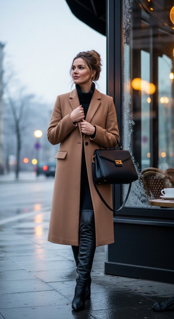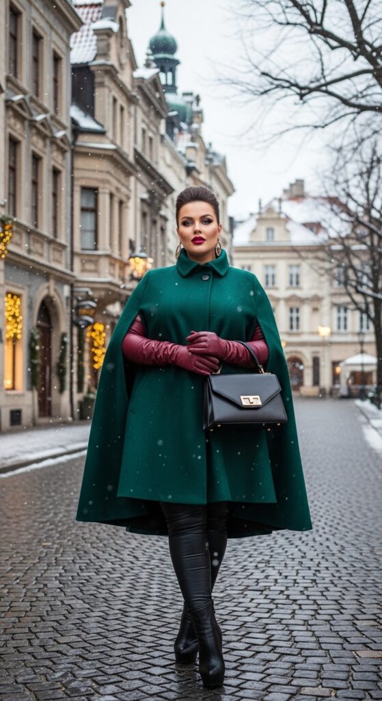 Cape coats are elegant and pair beautifully with fitted leggings. The silhouette creates balance — structured on top, sleek on the bottom. Add heeled boots and gloves for a sophisticated cold-weather look. This outfit feels luxurious and fashion-forward.