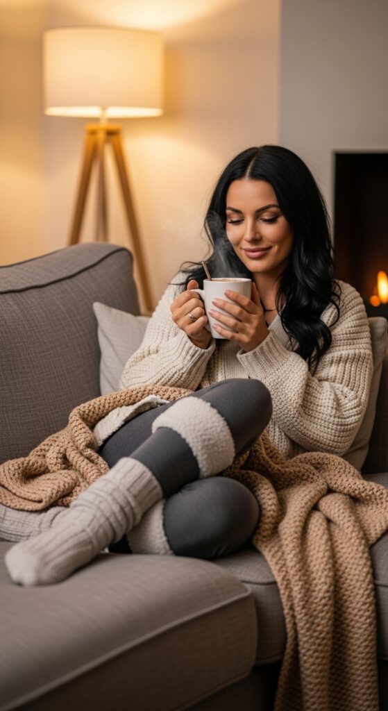 Embrace the ultimate comfort combo with a sherpa pullover and fleece-lined leggings. Add winter boots and a beanie for a Pinterest-worthy cozy look. It’s perfect for lazy Sundays, fireside lounging, or quick grocery runs. Soft textures make it irresistibly snuggly.