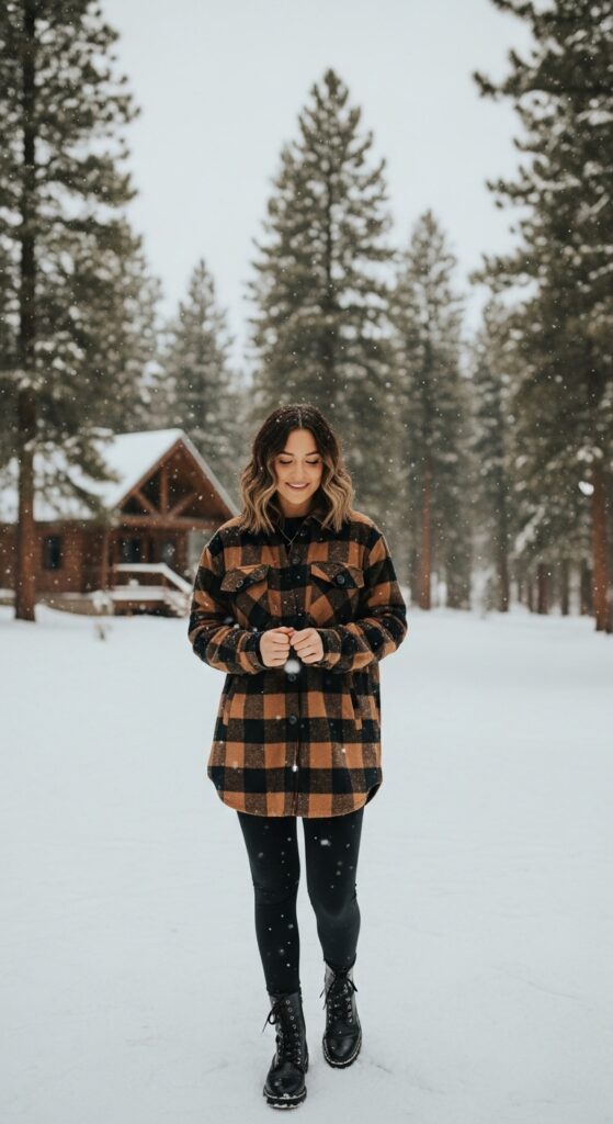 A plaid shacket over leggings is a Pinterest-favorite combination that blends warmth with effortless cool. Go for neutral or tan tones for that modern rustic vibe. Add combat boots and a beanie to complete the look. This ensemble works perfectly for winter adventures or cozy nights by the fire.