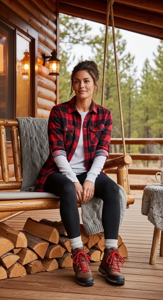 For a rustic, cabin-chic feel, throw on a flannel shirt over thermal leggings. Layer it with a plain tee or turtleneck and finish with hiking boots. This outfit is ideal for outdoor winter getaways, giving off relaxed yet put-together energy. Add a chunky scarf to stay extra warm.