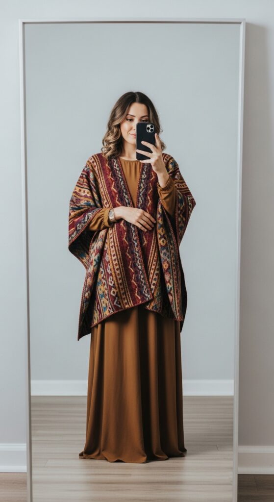 Ponchos are a fall essential. Wear one over a maxi dress for a modest boho-inspired look that’s both cozy and elegant.
