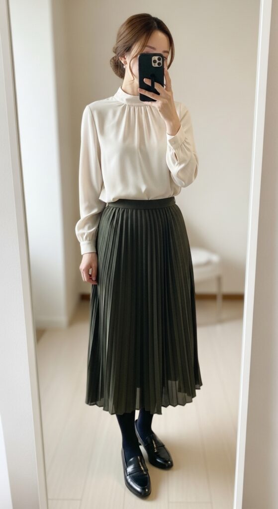 Pair a high-neck blouse with a midi pleated skirt and loafers for a feminine, fall-ready look that’s chic without being revealing.
