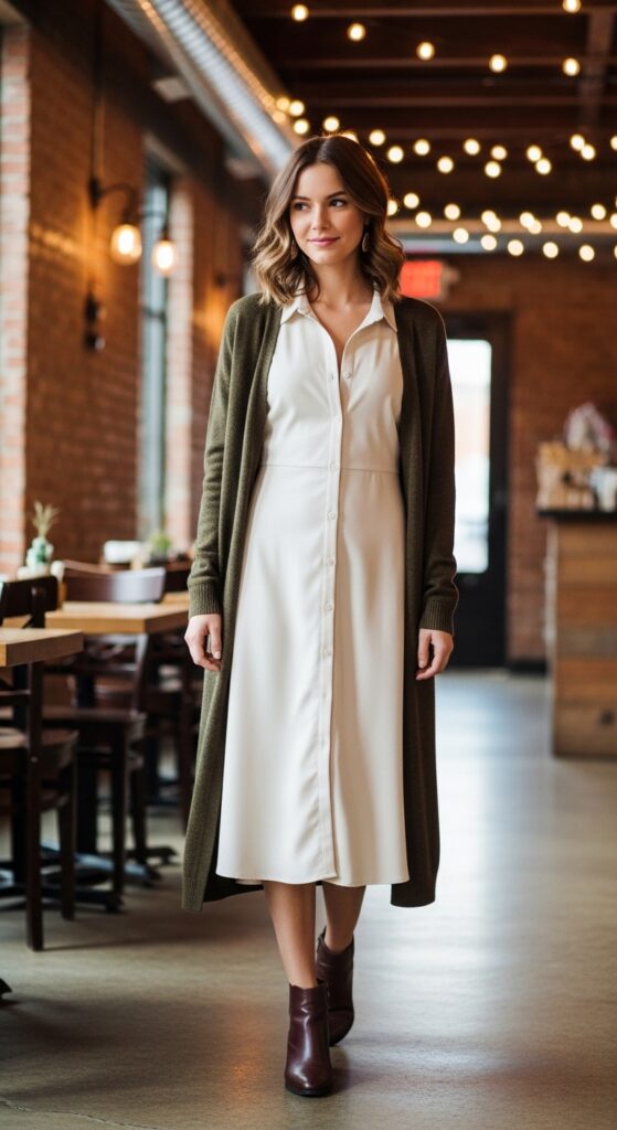 A shirt dress layered under a cozy cardigan offers modesty while keeping you stylish and warm on chilly days.