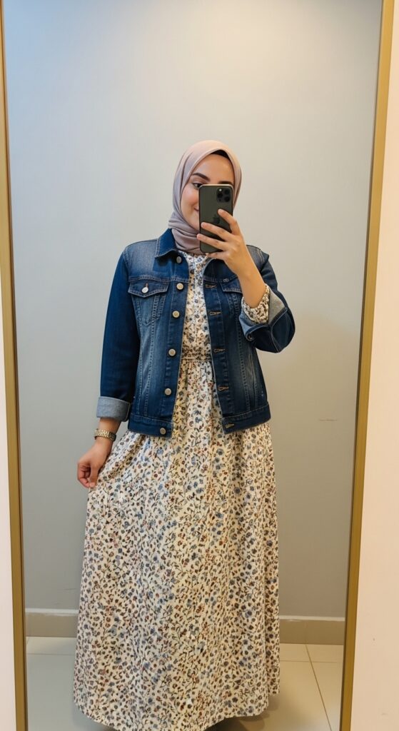Pair an ankle-length printed dress with a classic denim jacket. It’s casual, comfortable, and perfect for modest everyday wear.