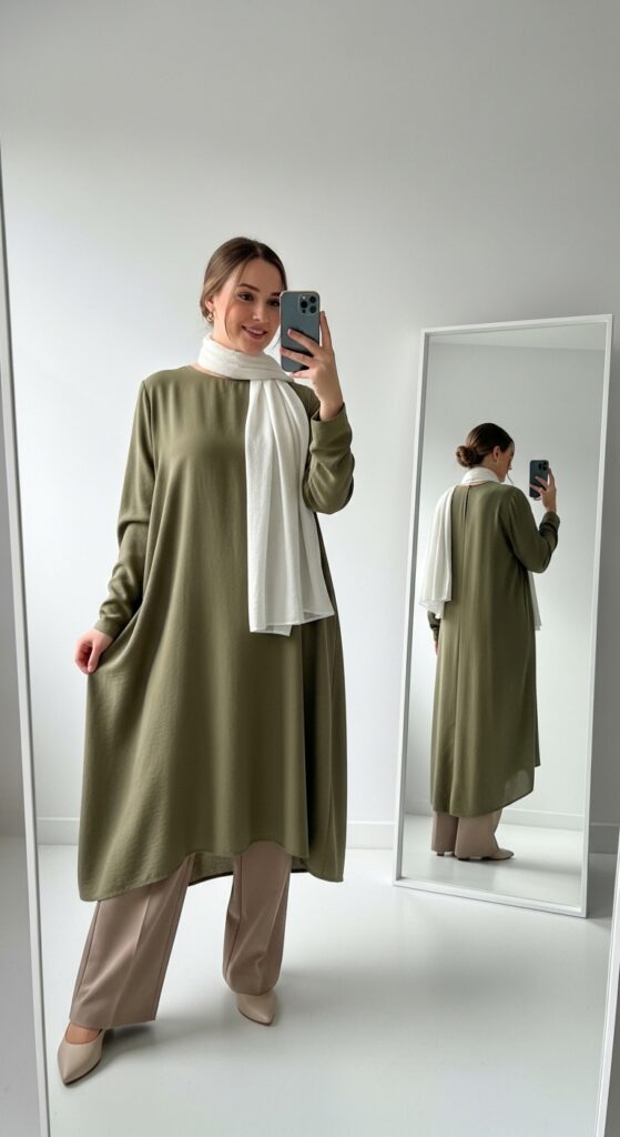 A modest yet modern choice — wear a tunic top with straight-leg pants. Add a scarf or lightweight shawl for extra layering.