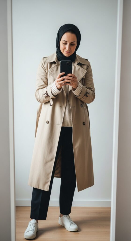 A trench coat styled over a knit top and full-length trousers keeps things refined while providing modest coverage.