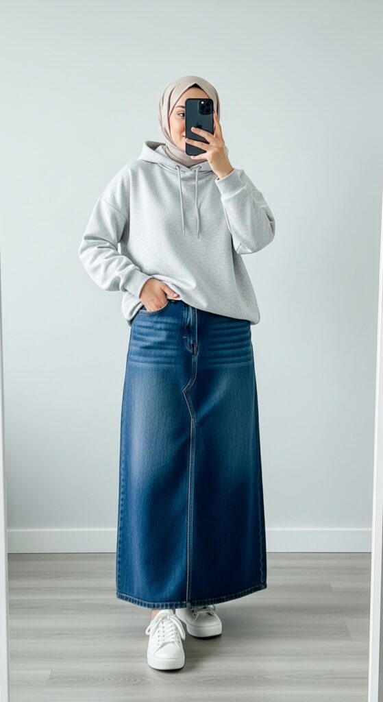 For a casual street-style modest outfit, pair a hoodie with a long denim skirt and sneakers.