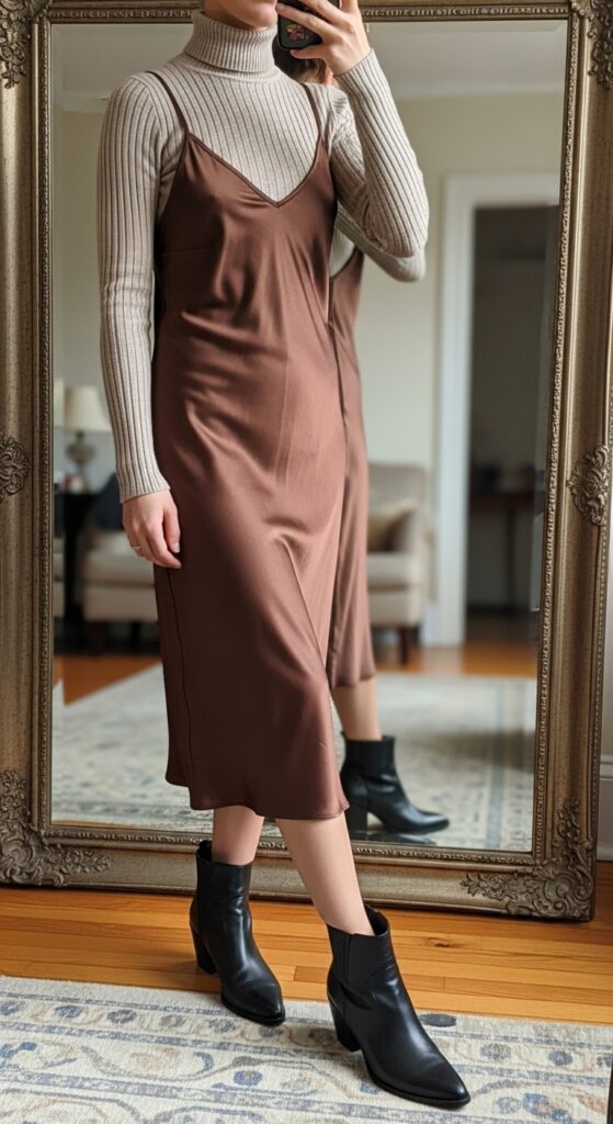 To make slip dresses modest, layer them over fitted turtlenecks. Add boots to complete the outfit with fall flair.