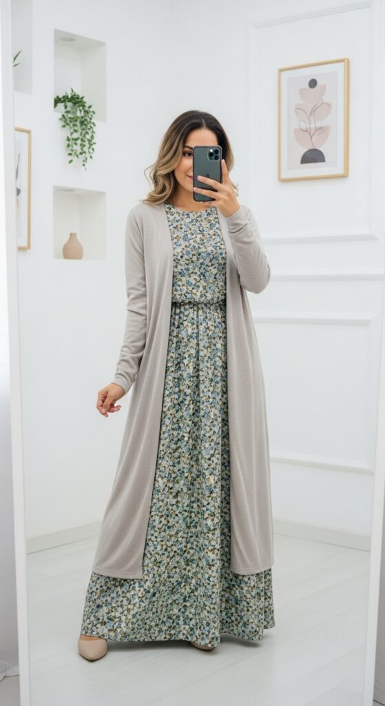 A floral or solid maxi dress styled with a long cardigan is a go-to modest outfit for fall days.