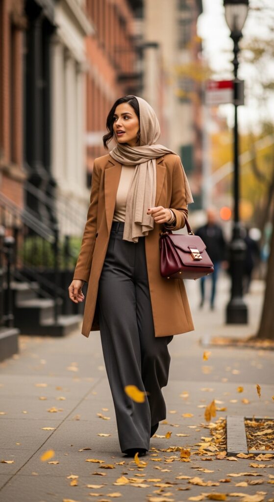 A tailored longline blazer layered over wide-leg trousers offers polish and coverage, perfect for modest workwear during fall.