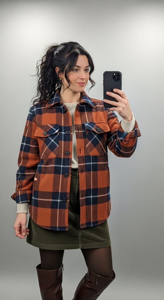 A plaid shacket worn with a knee-length corduroy skirt and tights offers modesty and warmth while keeping the look on-trend.