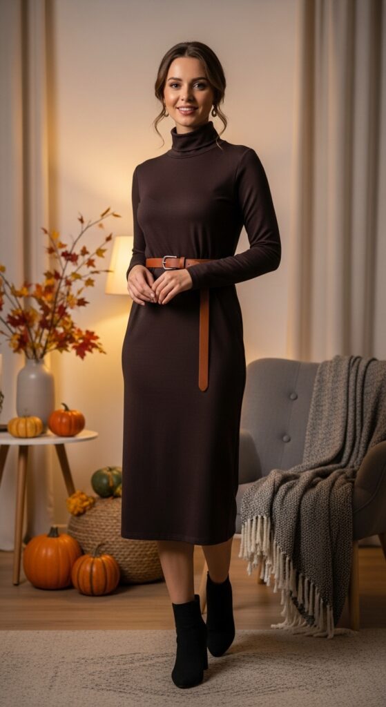 A midi-length turtleneck dress cinched with a belt creates an elegant silhouette while keeping the look modest and weather-appropriate.
