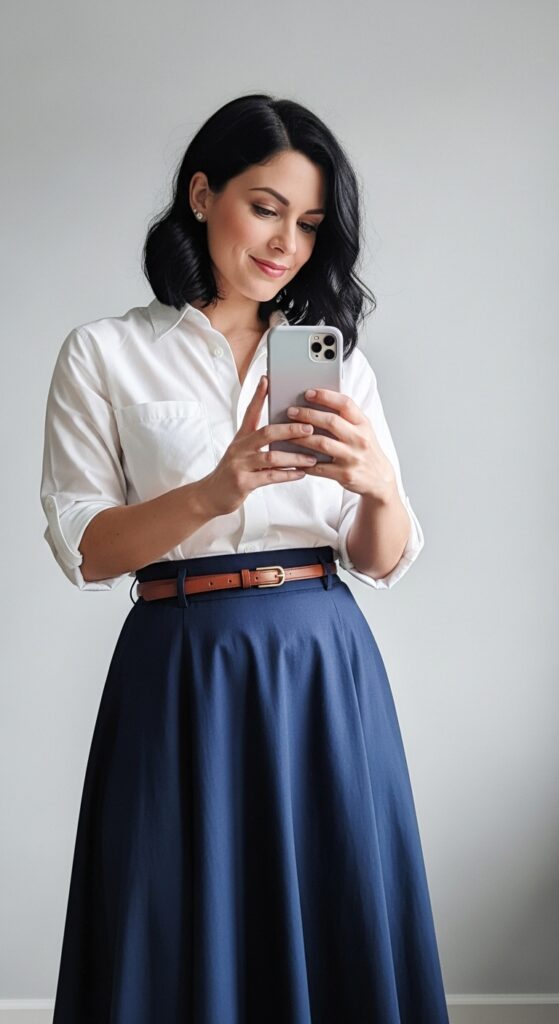 A crisp button-up shirt tucked into a high-waist A-line skirt is simple, stylish, and always modest.