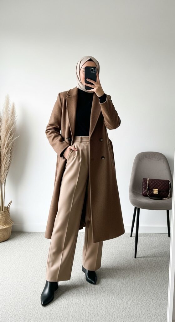 A classic wool coat styled over layered basics like a turtleneck and straight-fit pants is timeless and modest.