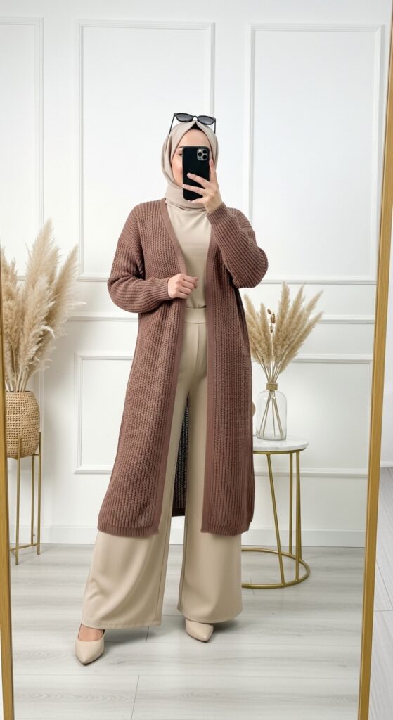 Palazzo pants paired with a long knit cardigan create a flowy, modest fall outfit that works for casual and semi-formal occasions.