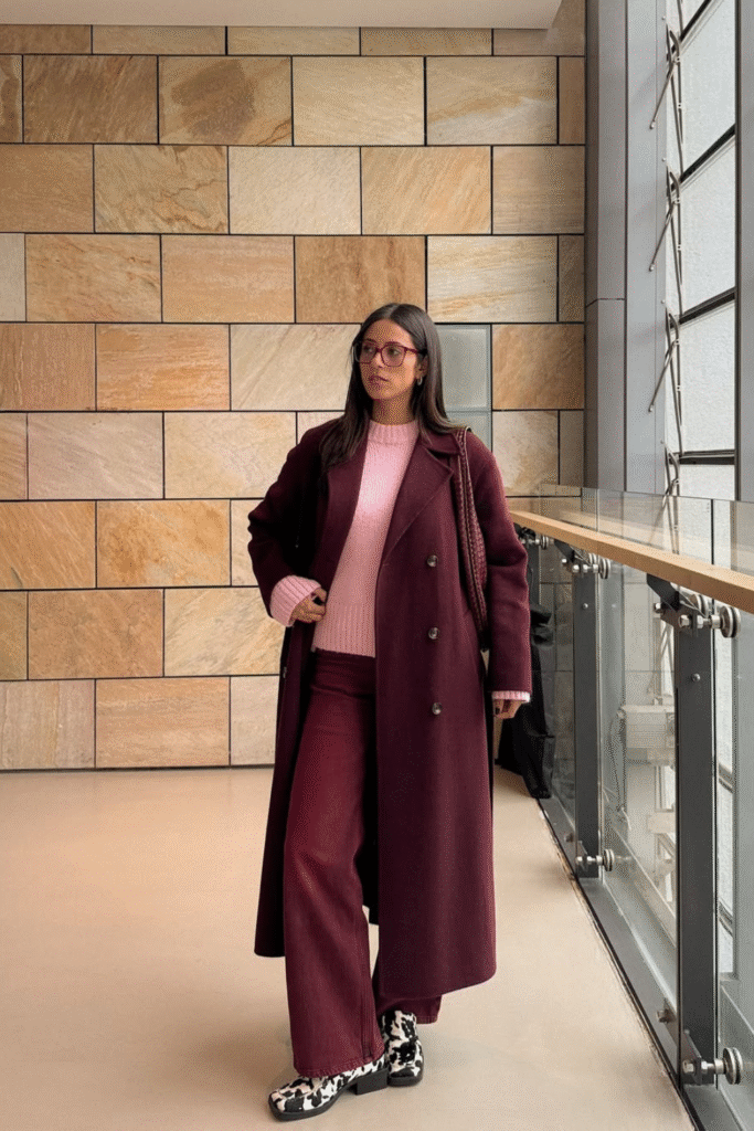 For cooler seasons, this outfit offers warmth, refinement, and beautiful tonal harmony. The plum wool overcoat makes a statement without feeling loud, while blush knit layers soften the look with feminine undertones. This ensemble is perfect for commuting, cold-weather offices, or days with outdoor meetings, providing insulation without compromising on style. The mix of warm and cool tones creates a sophisticated palette that feels fresh and thoughtfully curated.
