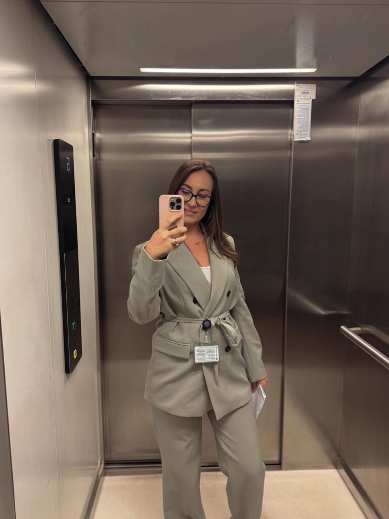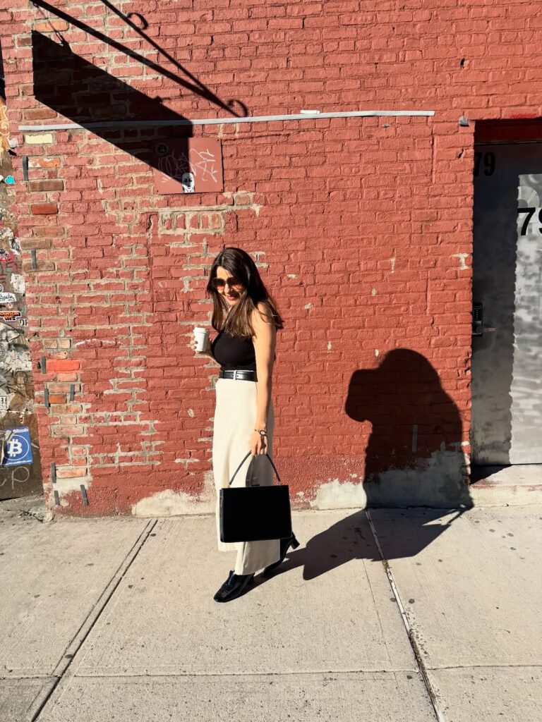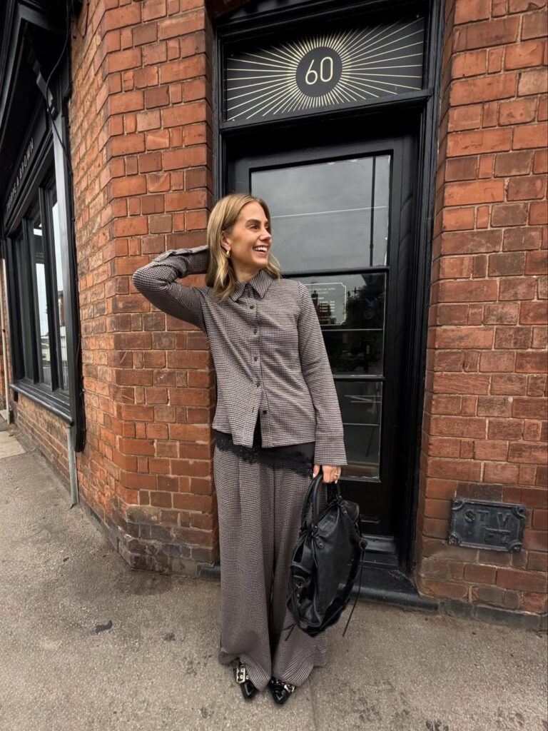 This outfit embodies quiet luxury with subtle prints and sleek dark accents. The micro-check tailoring adds depth and refinement without feeling overpowering, making it perfect for more formal office settings. Noir accessories bring contrast and define the silhouette, giving the look a modern, editorial finish. It’s the kind of ensemble that feels effortlessly powerful—structured, minimalist, and perfect for days when you want to project confidence while staying completely comfortable.
