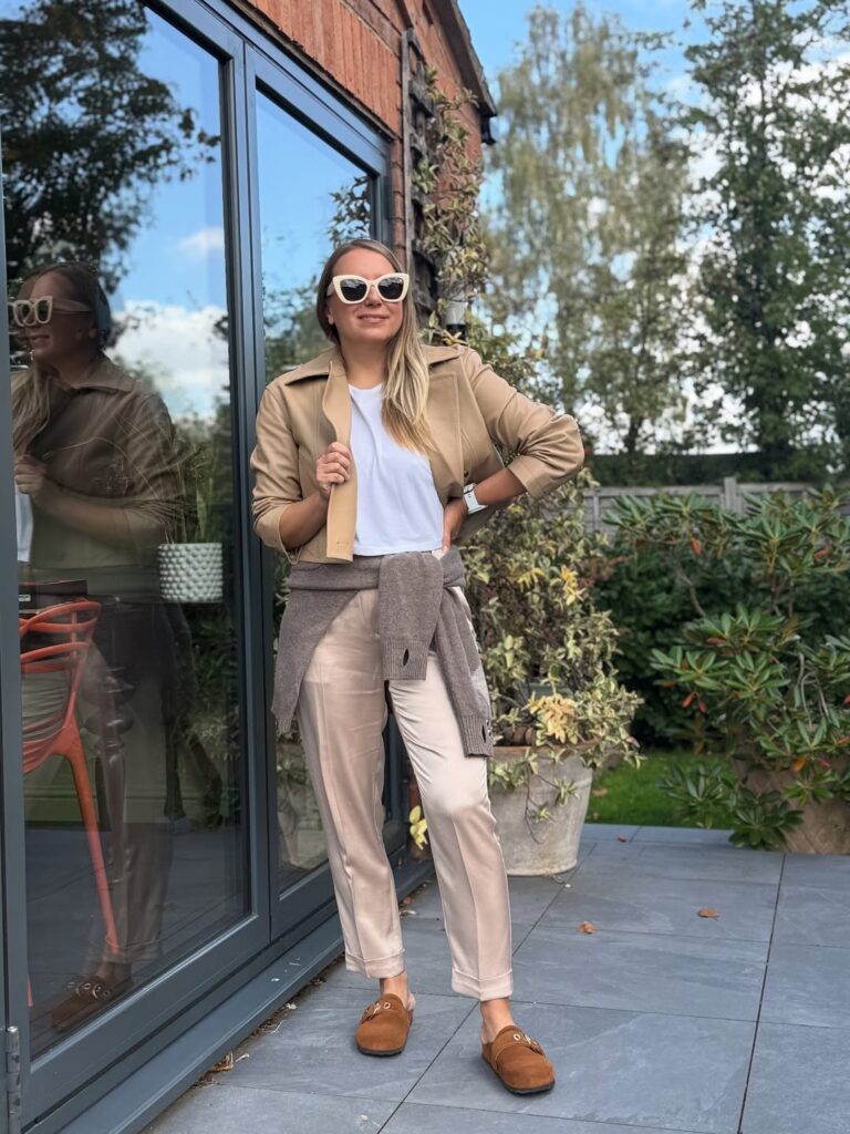 A layered taupe jacket brings subtle depth and structure to this polished ensemble. Paired with satin cropped trousers, the look becomes effortlessly chic with a soft touch of shine that feels modern and refined. This outfit works well for transitional weather or days packed with meetings, offering comfort through breathable fabrics while maintaining a sleek, put-together silhouette. The mix of textures creates visual interest without overwhelming the outfit’s understated elegance.